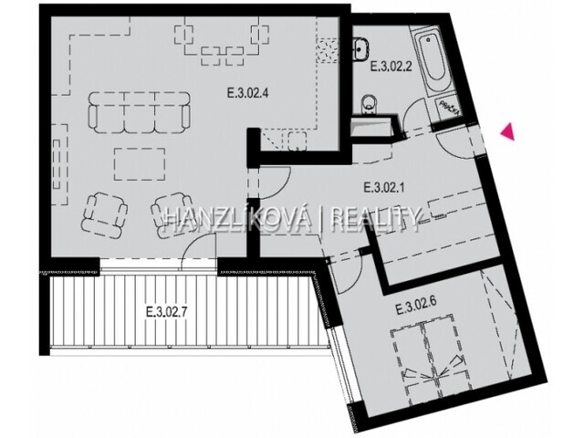 E.3.02. Jedná se o byt 2+kk o výměře 74,77 m2 + terasa 13,67 m2, který
