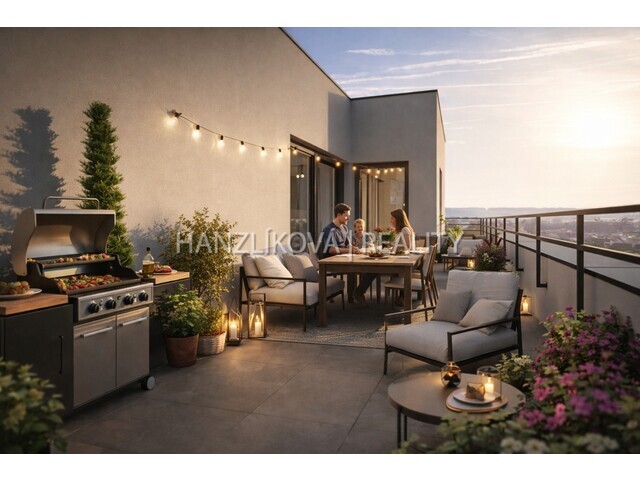 Terasa, která nahrazuje zahradu. Velkorysá terasa podél bytu nabízí
